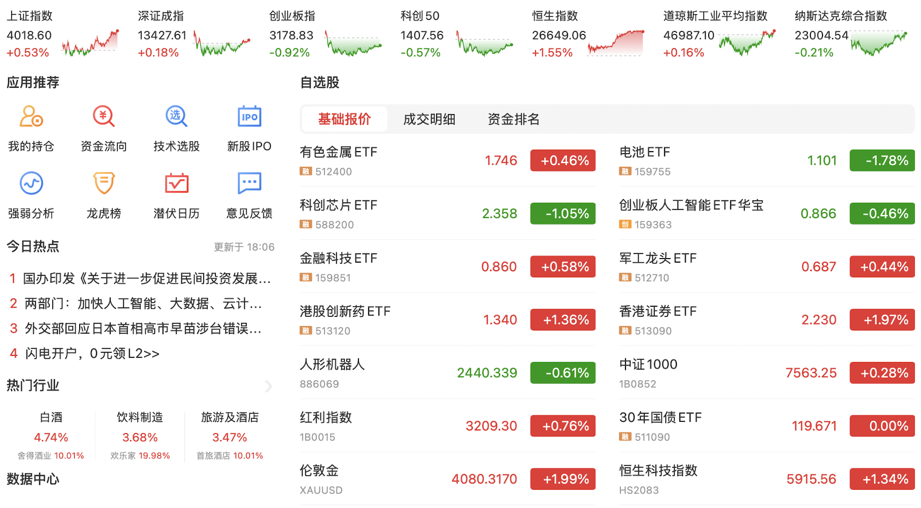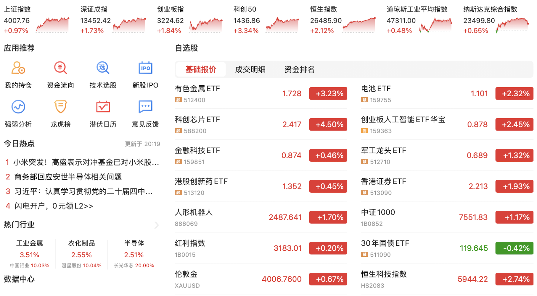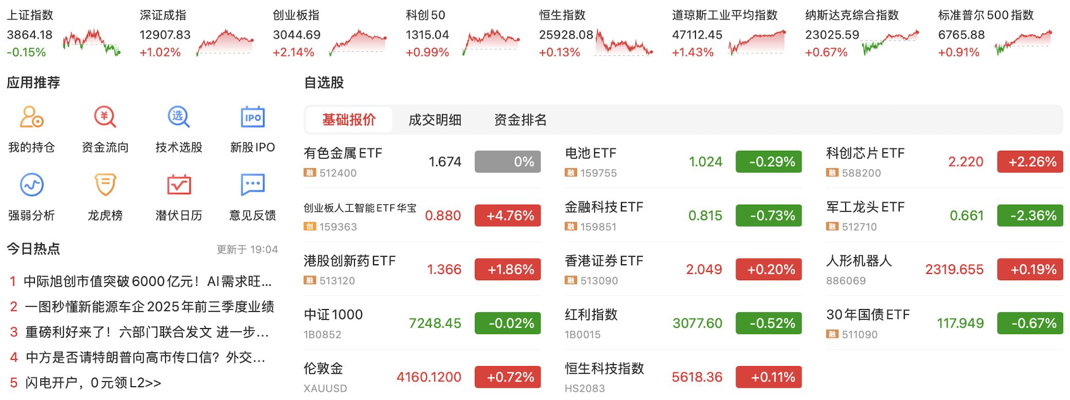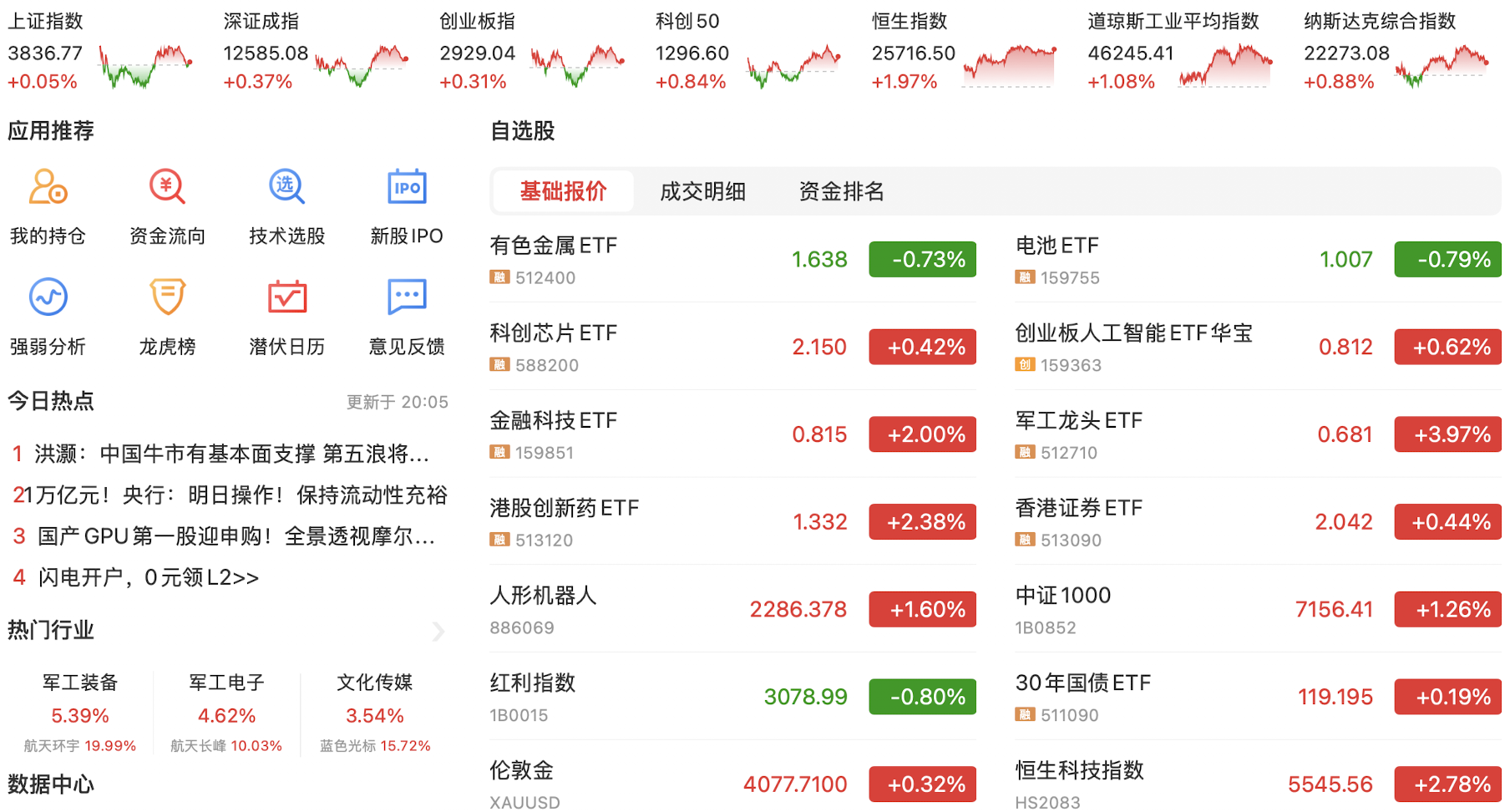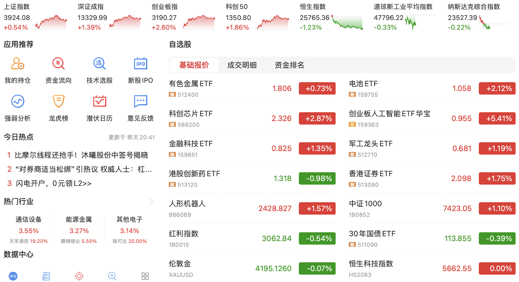 今天在昨日美股大涨的催化下,A股科技股和资源股小幅反弹,以紫金矿业与浪潮信息的反弹为代表,走出了一个技术修复。目前资源股和人工智能科技股的趋势线勾头向上,希望能有持续性。今日主要指数下跌,可见短线趋势并没有改变,但国家队突然现身并大量买入指数ETF,目前原因未明。目前降息预期落空,国债市场依然狂飙不止,没有刺激性政策A股短期难言趋势转好,继续看资源股的修复和恒生科技的上涨行情,A股继续保持谨慎。