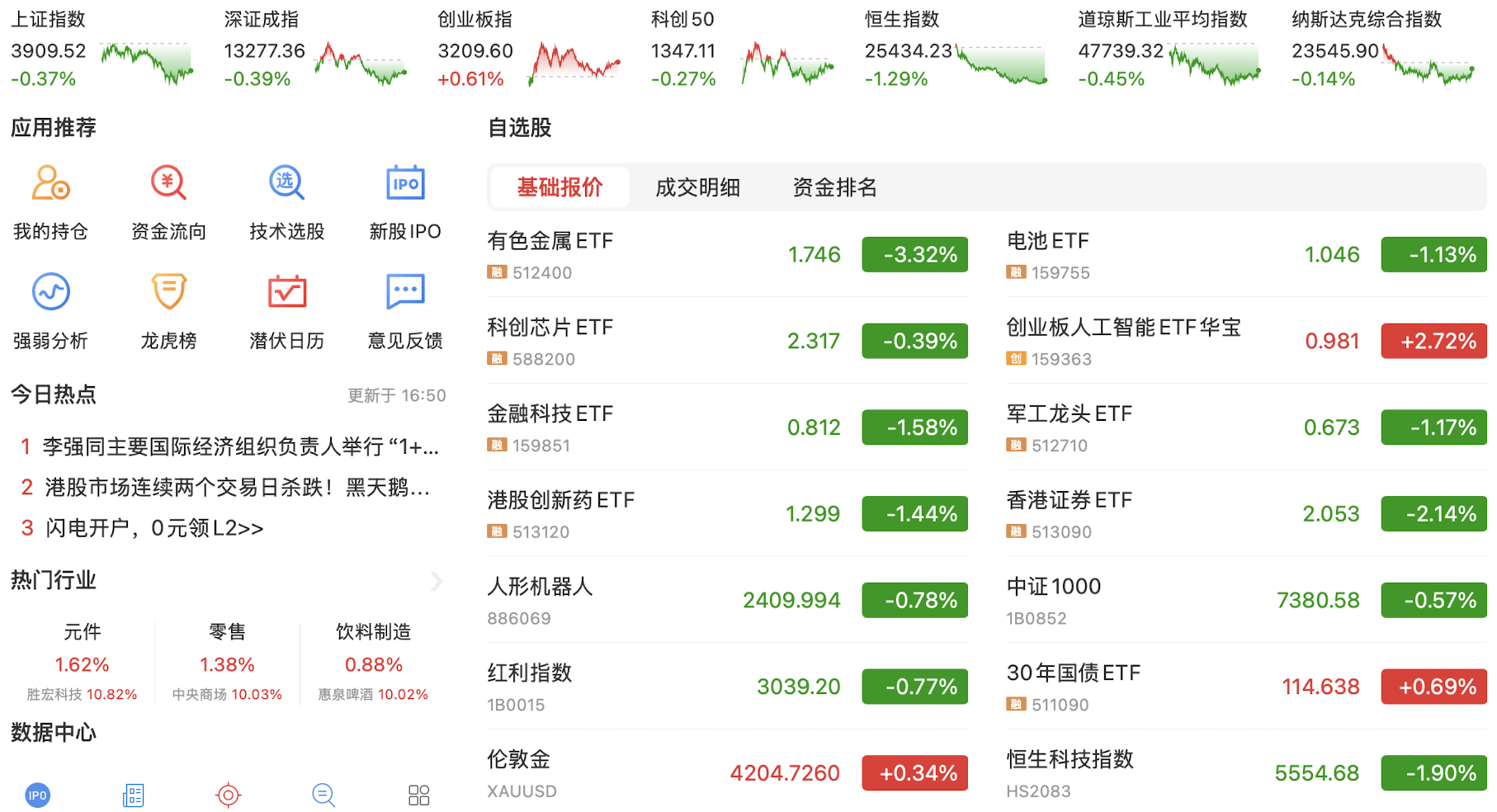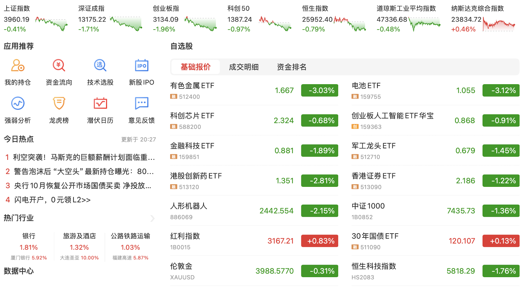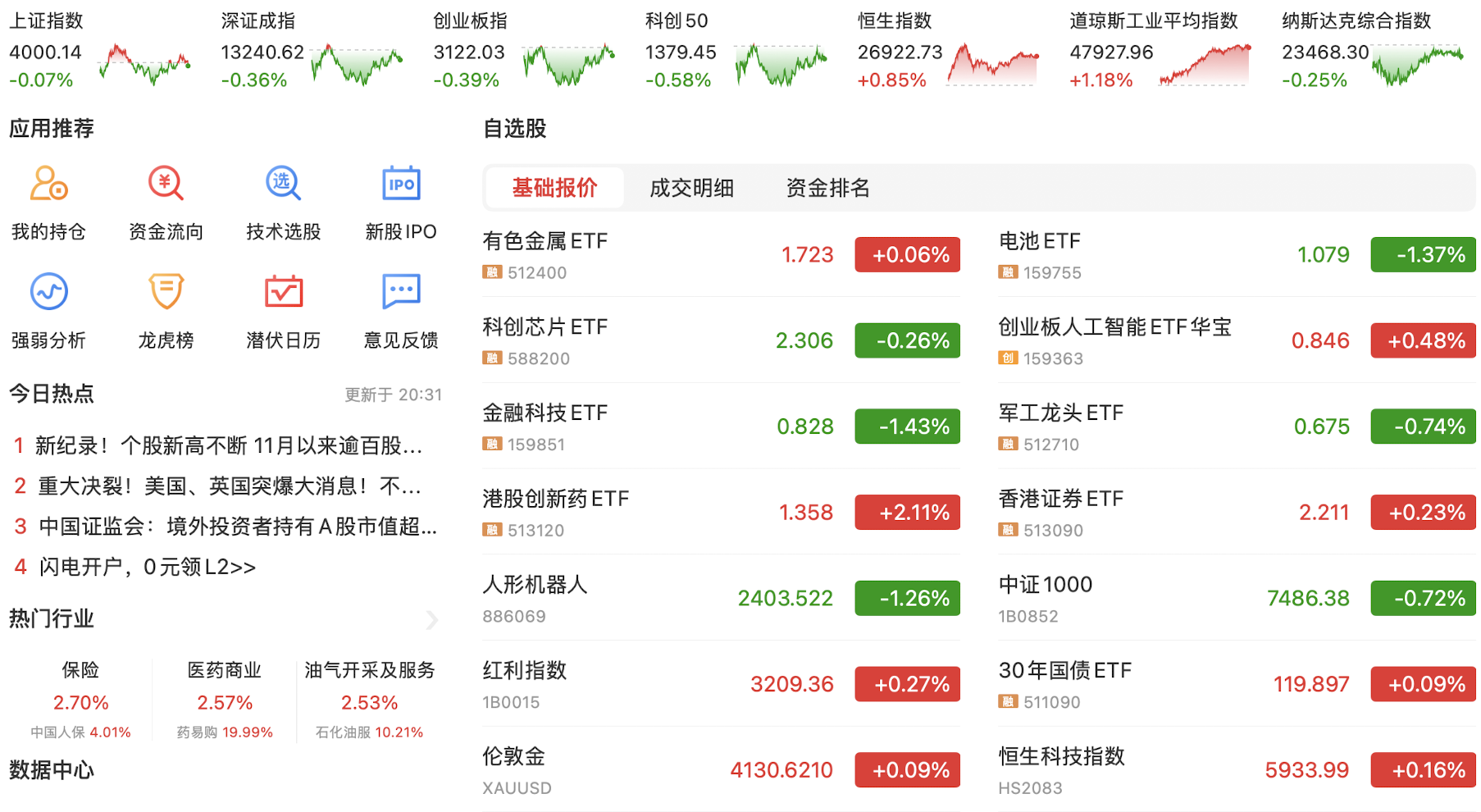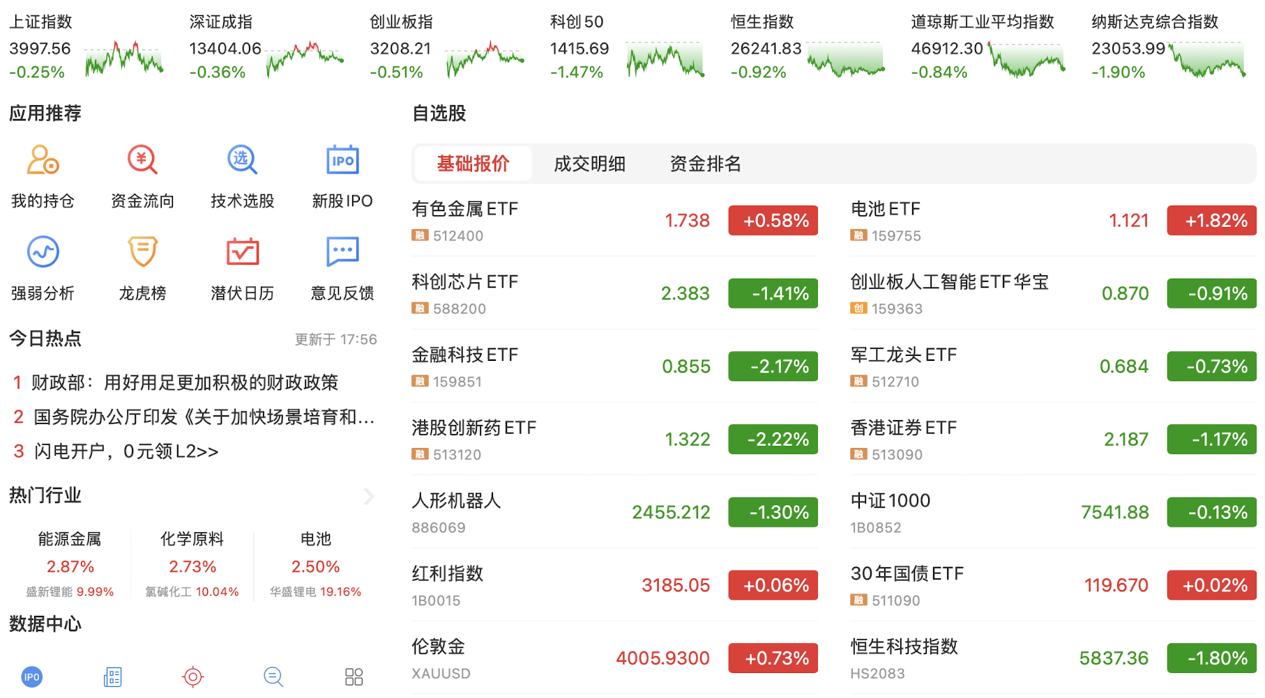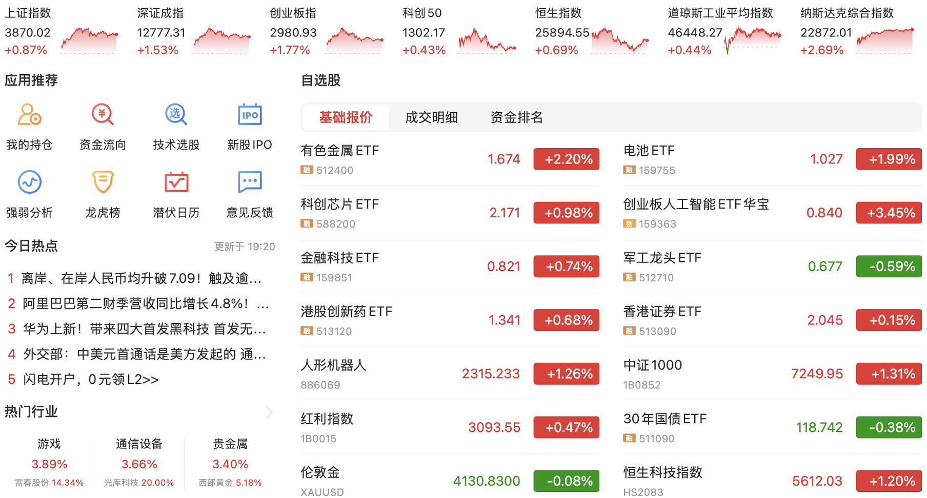 今天在昨日美股大涨的催化下,A股科技股和资源股小幅反弹,以紫金矿业与浪潮信息的反弹为代表,走出了一个技术修复。目前资源股和人工智能科技股的趋势线勾头向上,希望能有持续性。今日主要指数下跌,可见短线趋势并没有改变,但国家队突然现身并大量买入指数ETF,目前原因未明。目前降息预期落空,国债市场依然狂飙不止,没有刺激性政策A股短期难言趋势转好,继续看资源股的修复和恒生科技的上涨行情,A股继续保持谨慎。
