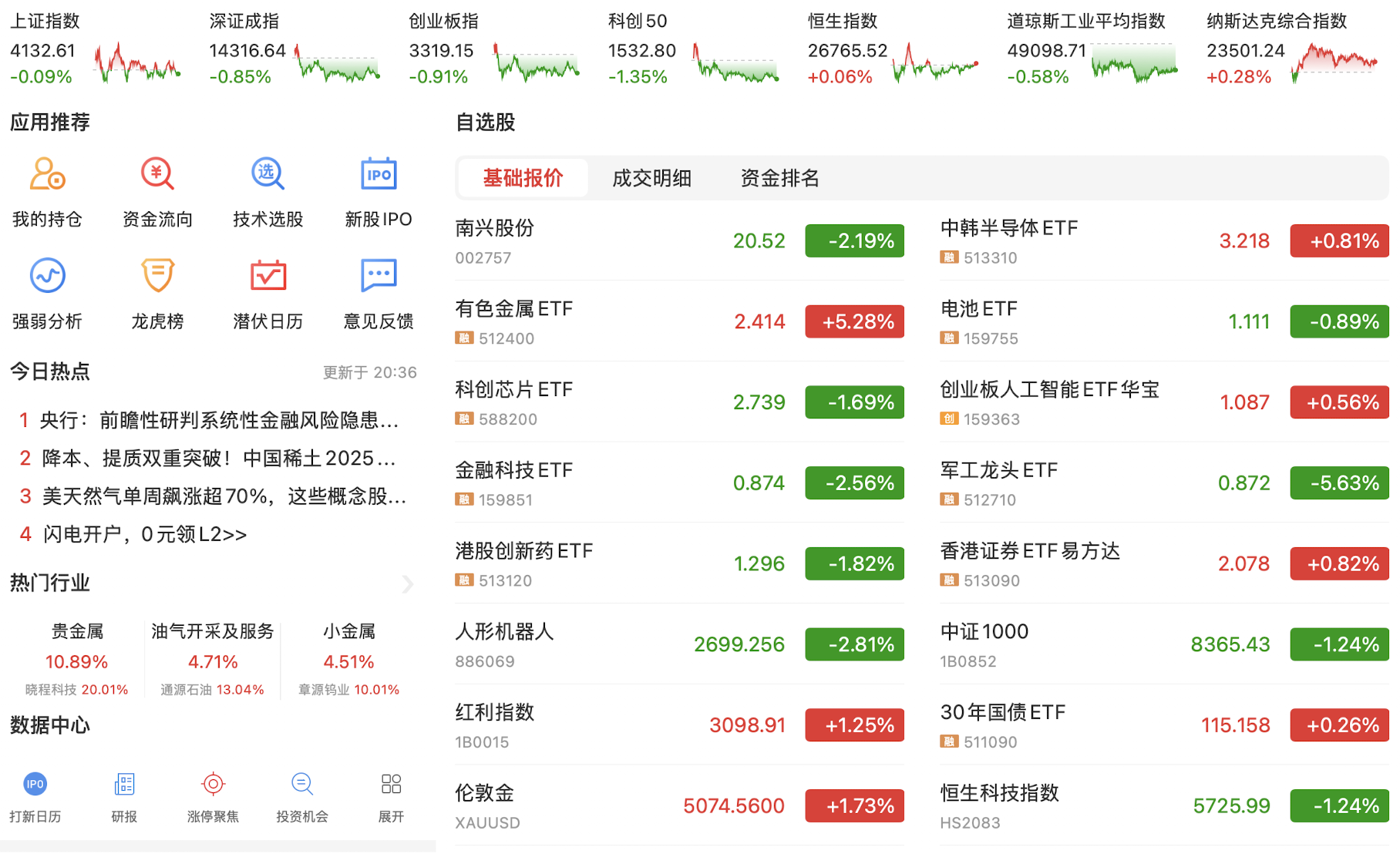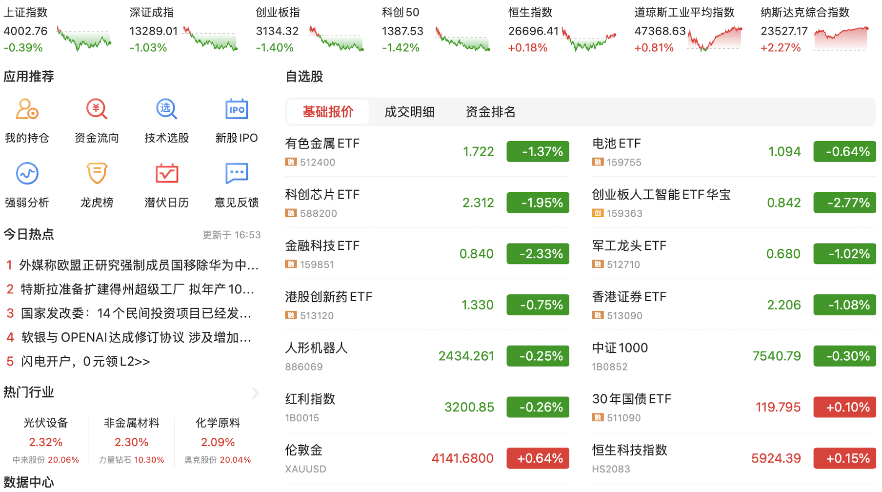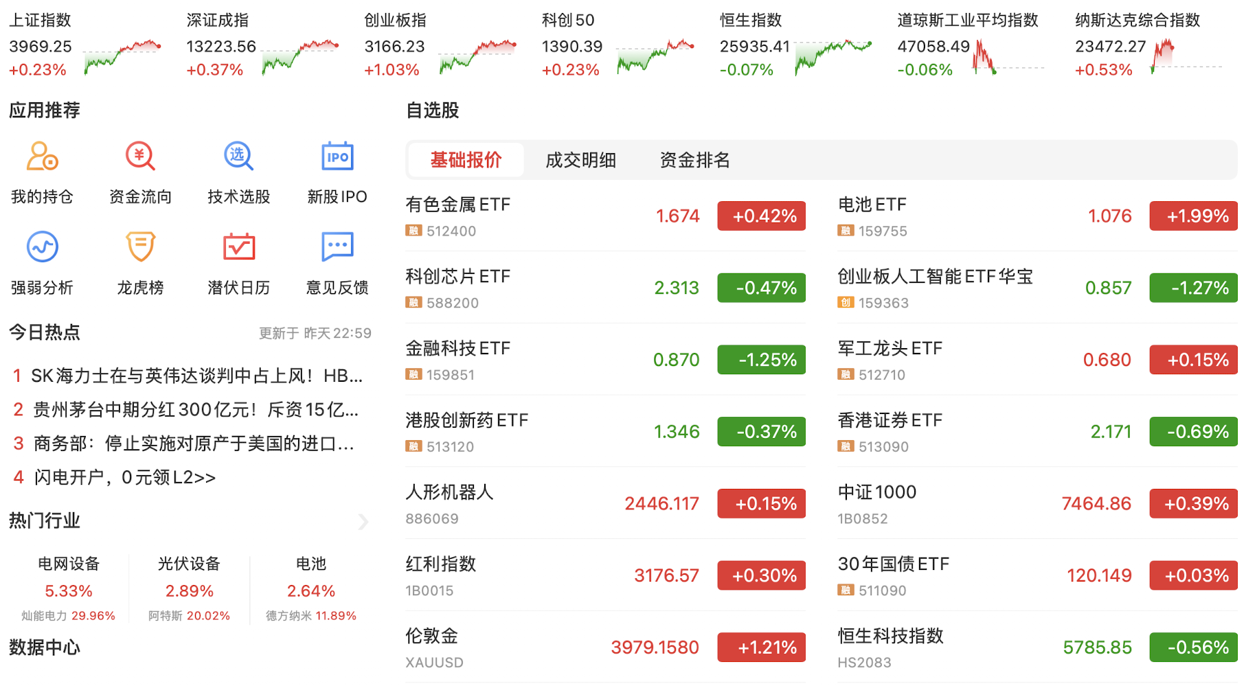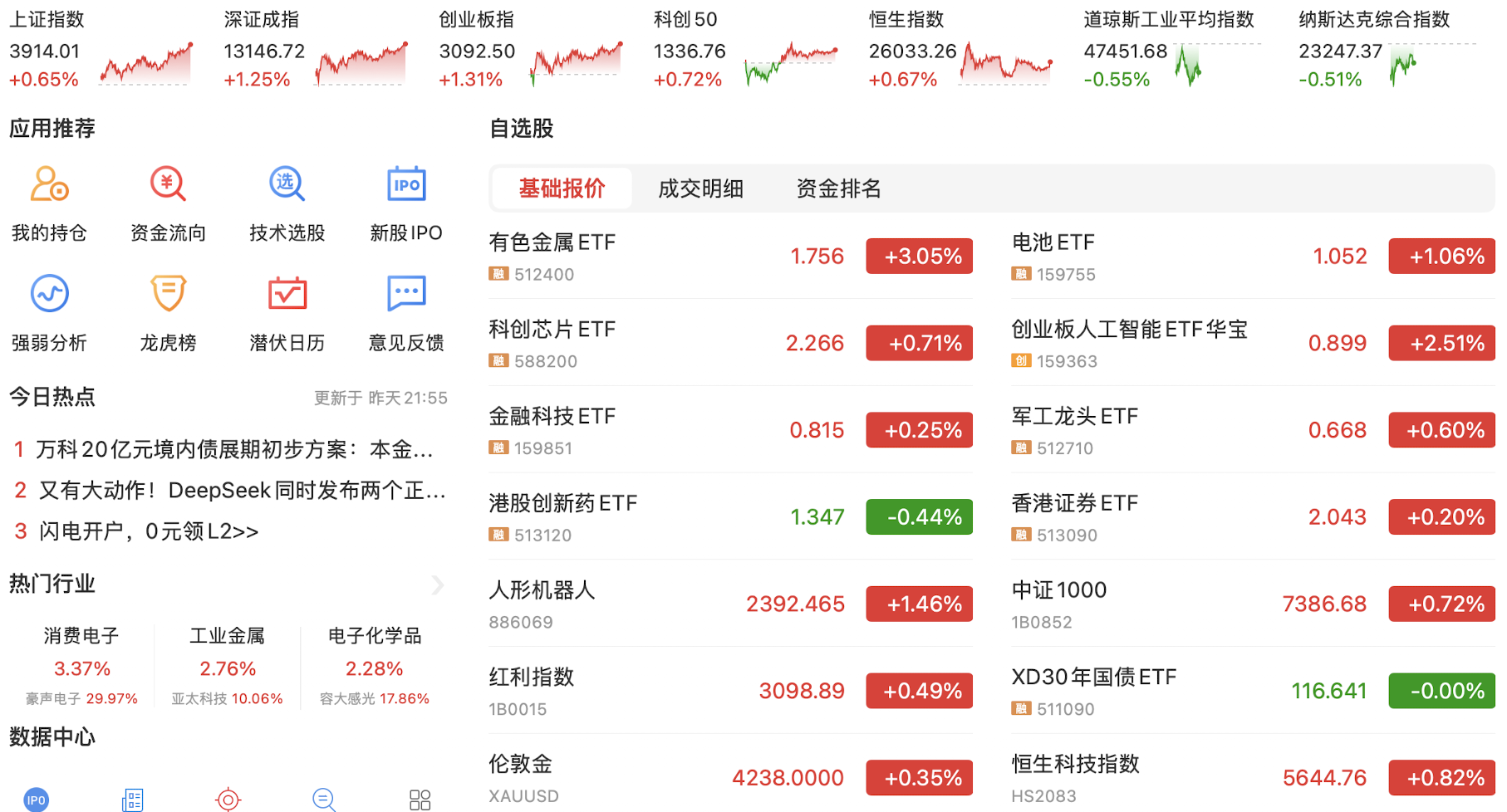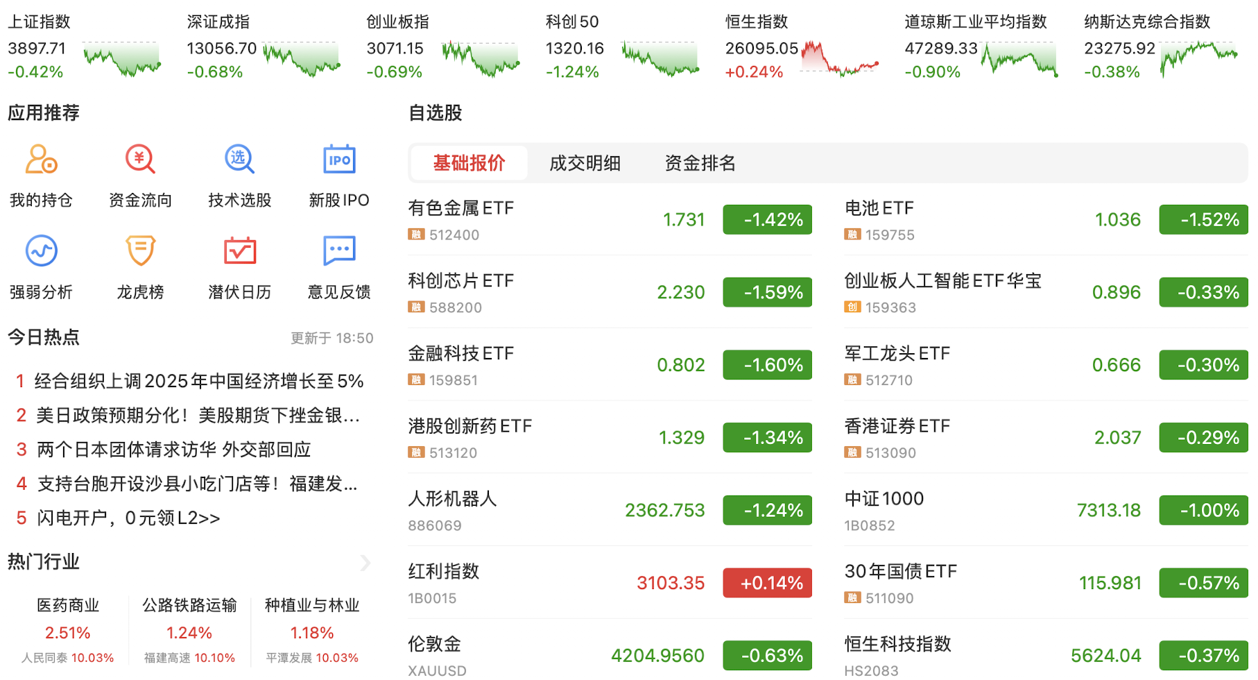 今天在昨日美股大涨的催化下,A股科技股和资源股小幅反弹,以紫金矿业与浪潮信息的反弹为代表,走出了一个技术修复。目前资源股和人工智能科技股的趋势线勾头向上,希望能有持续性。今日主要指数下跌,可见短线趋势并没有改变,但国家队突然现身并大量买入指数ETF,目前原因未明。目前降息预期落空,国债市场依然狂飙不止,没有刺激性政策A股短期难言趋势转好,继续看资源股的修复和恒生科技的上涨行情,A股继续保持谨慎。