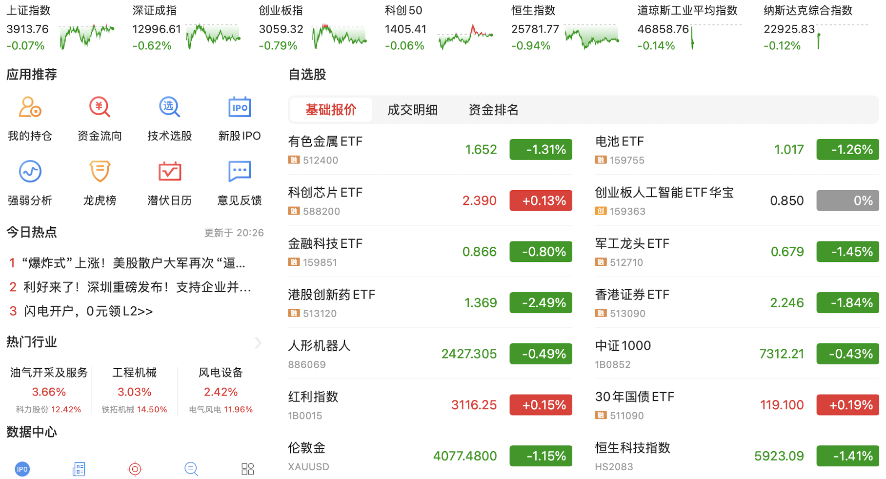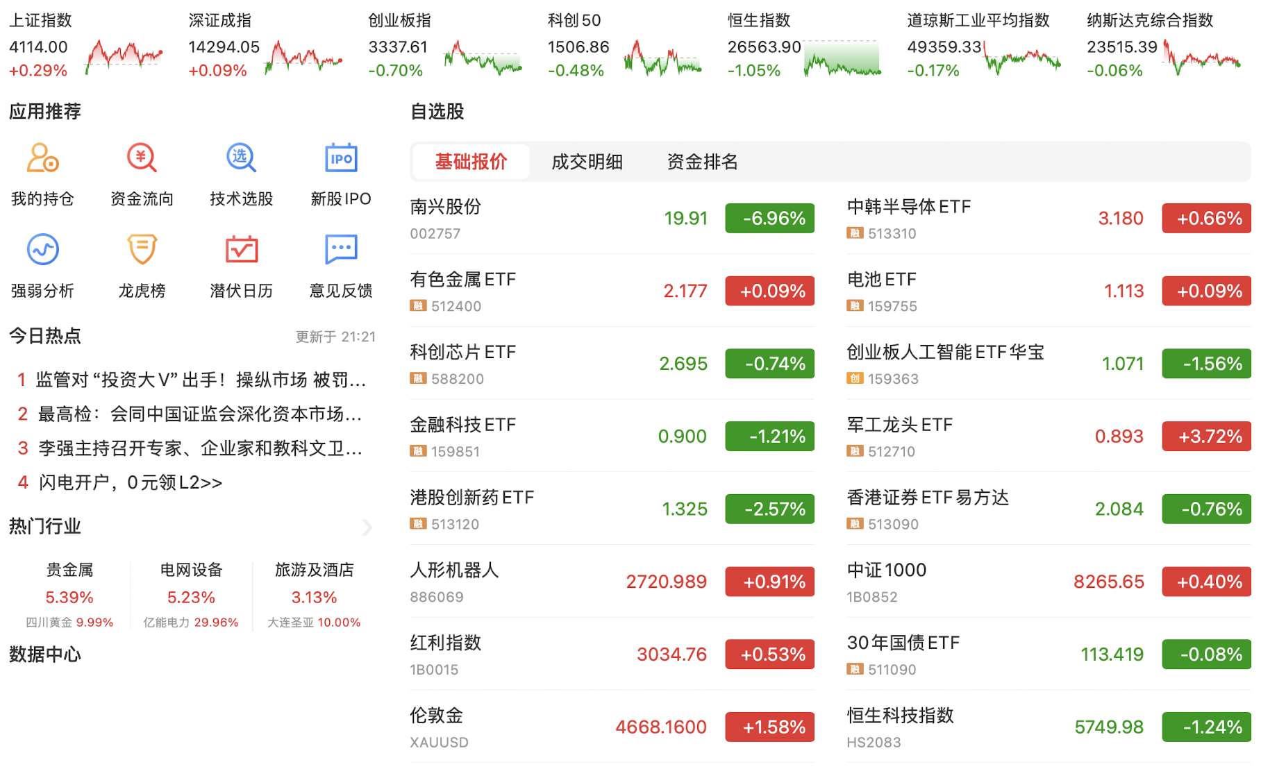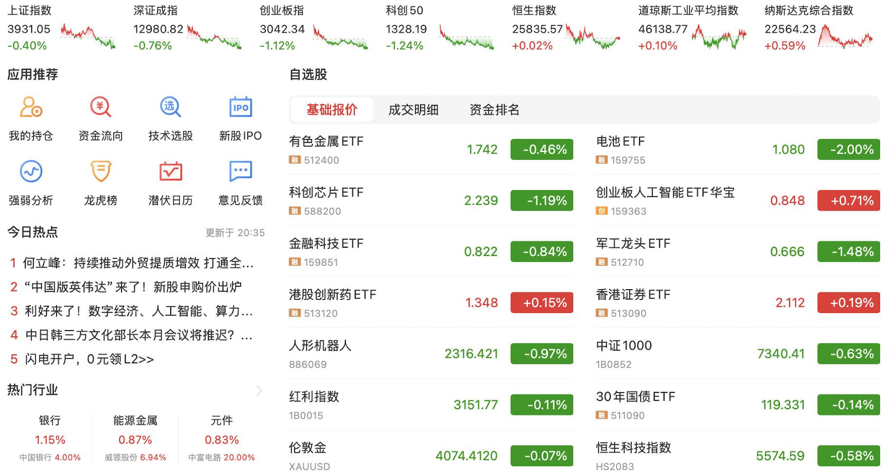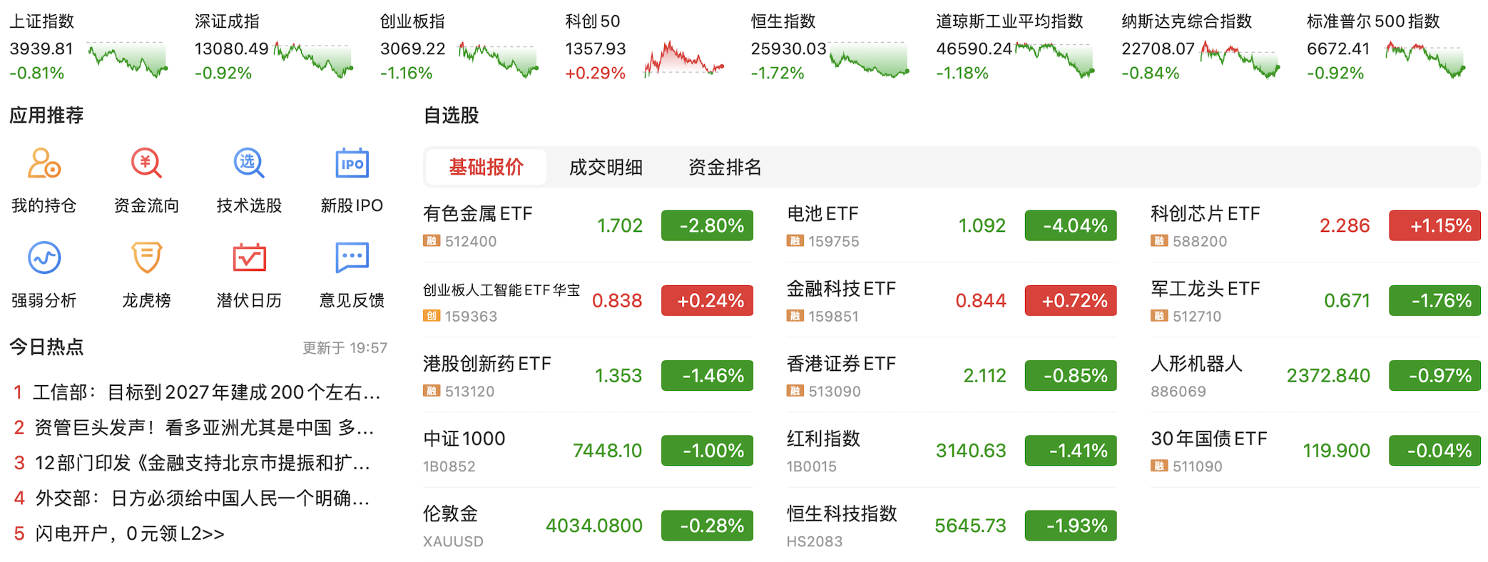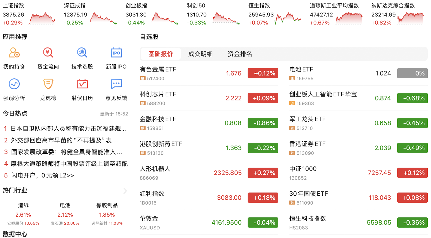 今天在昨日美股大涨的催化下,A股科技股和资源股小幅反弹,以紫金矿业与浪潮信息的反弹为代表,走出了一个技术修复。目前资源股和人工智能科技股的趋势线勾头向上,希望能有持续性。今日主要指数下跌,可见短线趋势并没有改变,但国家队突然现身并大量买入指数ETF,目前原因未明。目前降息预期落空,国债市场依然狂飙不止,没有刺激性政策A股短期难言趋势转好,继续看资源股的修复和恒生科技的上涨行情,A股继续保持谨慎。