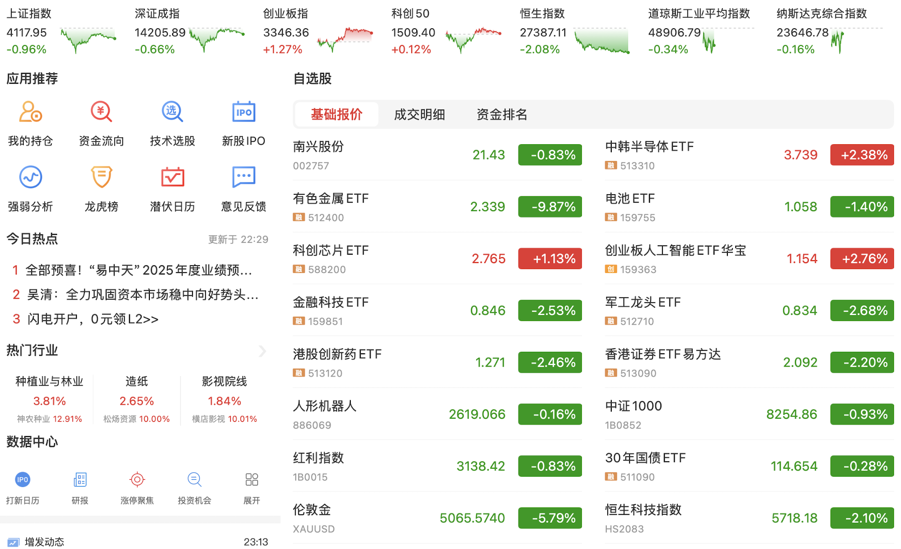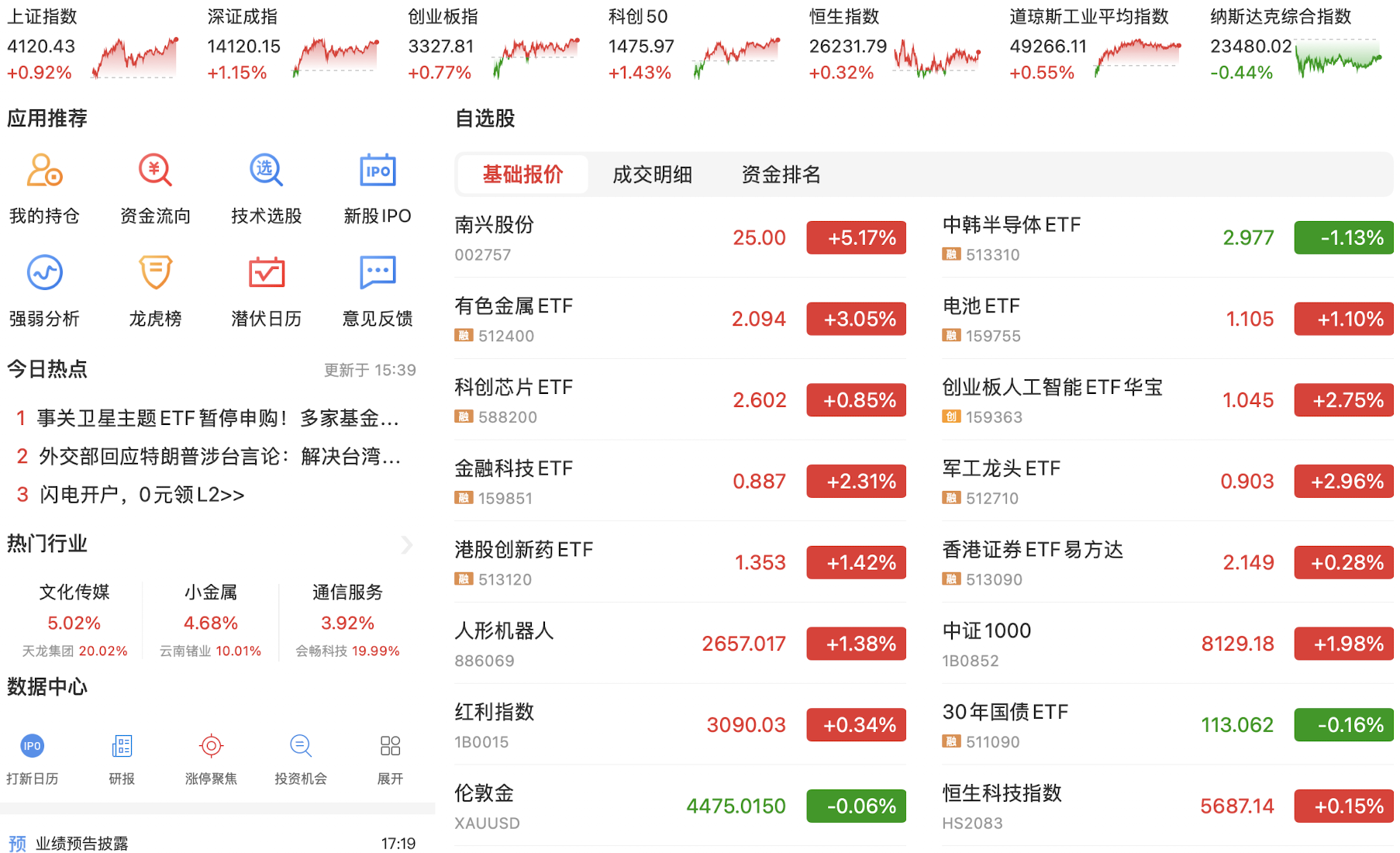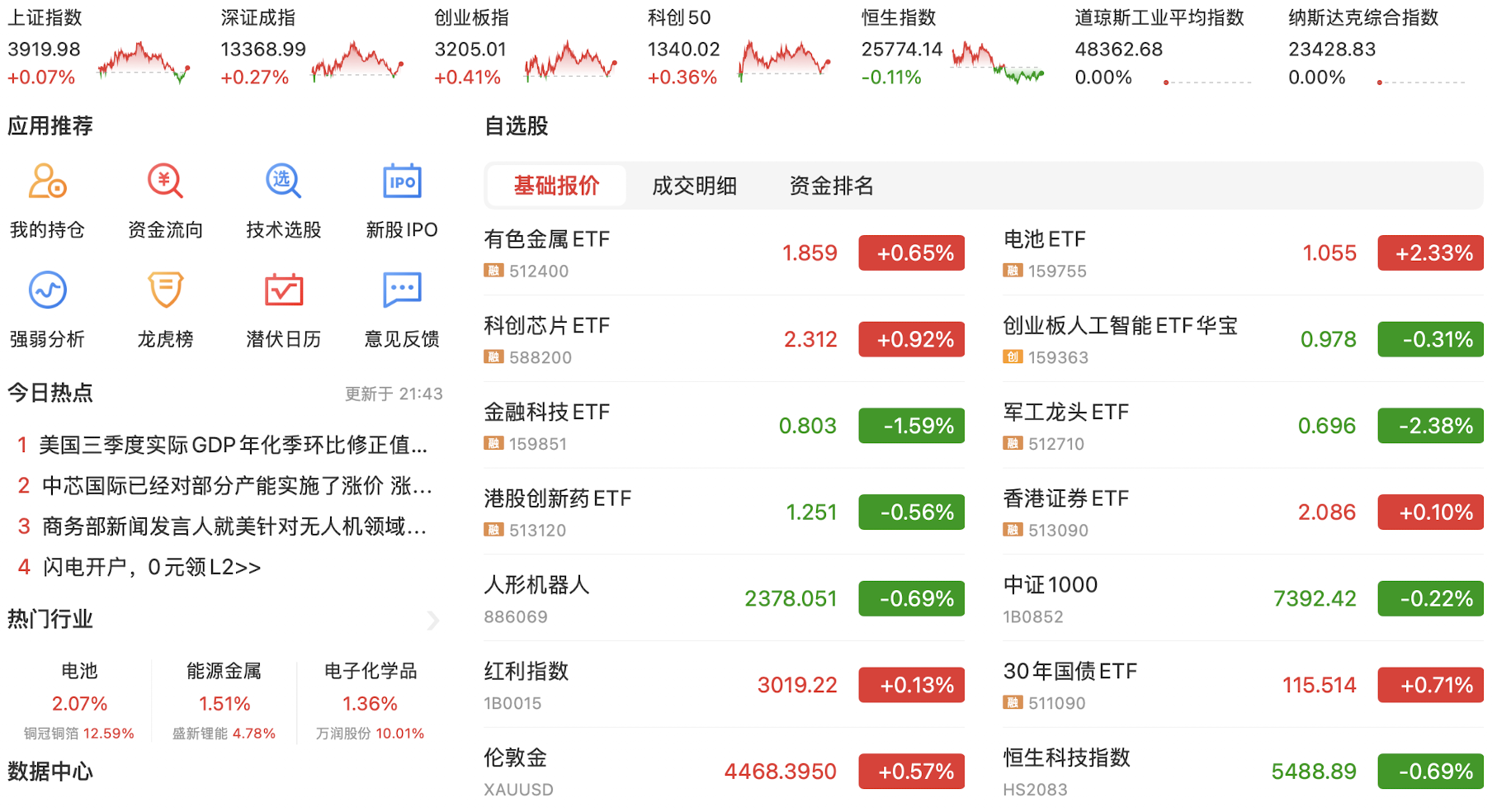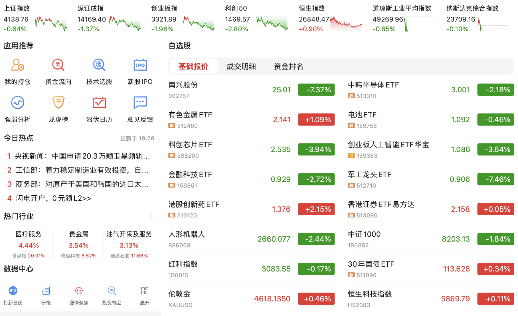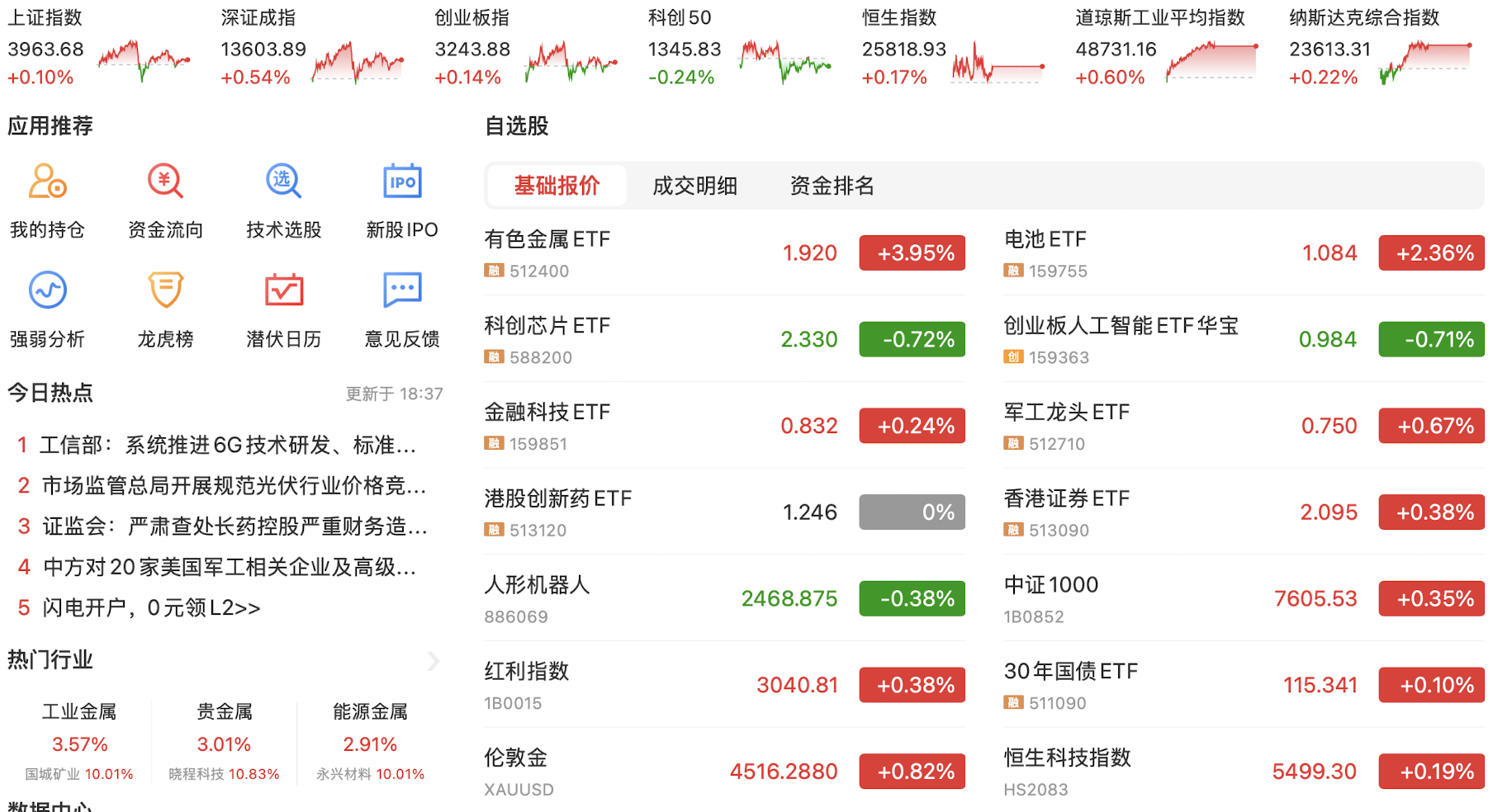 今天在昨日美股大涨的催化下,A股科技股和资源股小幅反弹,以紫金矿业与浪潮信息的反弹为代表,走出了一个技术修复。目前资源股和人工智能科技股的趋势线勾头向上,希望能有持续性。今日主要指数下跌,可见短线趋势并没有改变,但国家队突然现身并大量买入指数ETF,目前原因未明。目前降息预期落空,国债市场依然狂飙不止,没有刺激性政策A股短期难言趋势转好,继续看资源股的修复和恒生科技的上涨行情,A股继续保持谨慎。