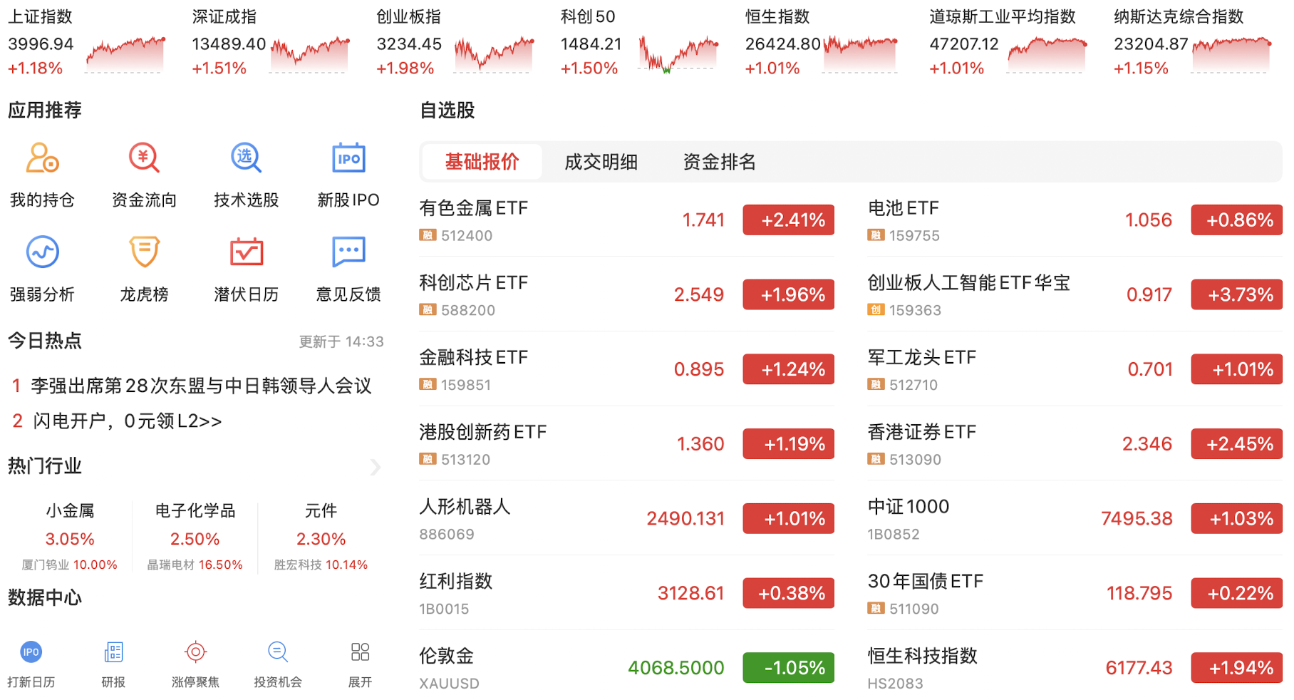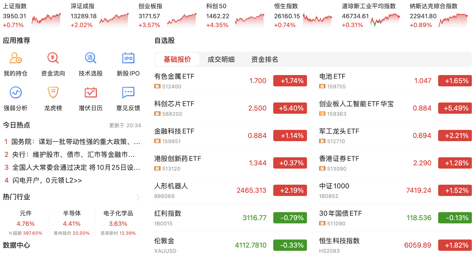 A股很久没有出现这样的强力中阳线了。今日由券商带队,科技股全面爆发,成交量超9000亿,可见情绪回暖和博弈利好的活跃。今日资金行为主要解读为昨日重要会议提出的新论调,和资金提前交易明日美联储鸽派信息的放出。但目前汇率端和国债端并没有形成跷跷板效应,主要为短期炒作资金做的超跌反弹行为,近日逢高可以逐渐优化仓位。