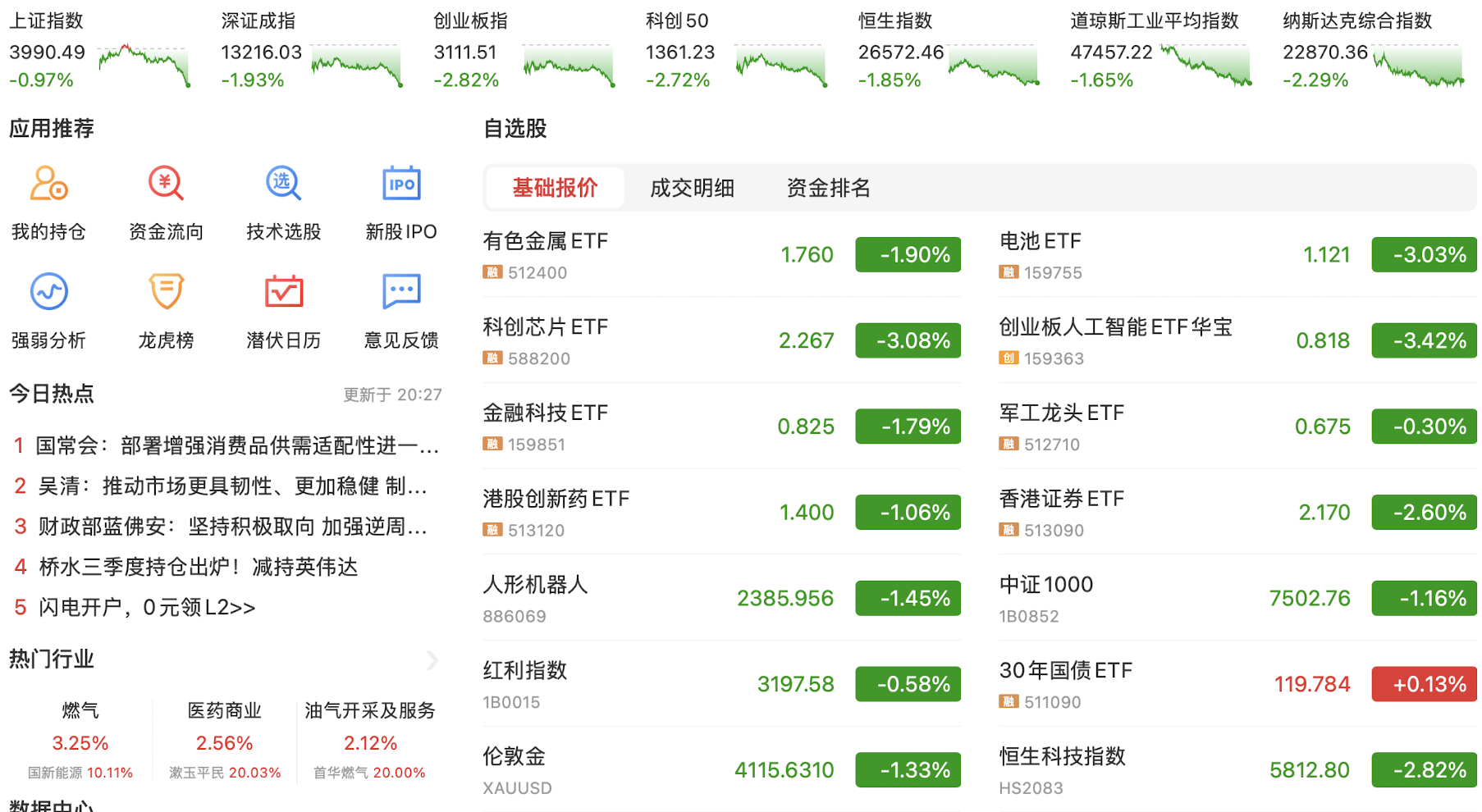 今天A股走出一根中阴线,但没有出现放量的恐慌,继续处于加速下跌趋势。目前已经即将达到年线支撑2750附近,可能会有所徘徊,但继续下探的可能性极大,除非能杀出两根中大阴线叠加政策和国家队双重发力才能快速走出修复上涨行情。目前已经没什么操作的机会,手中持有的股票已经位置很低,近期继续减少操作频率,在杀恐慌期间寻找错杀的高性价比股票。
