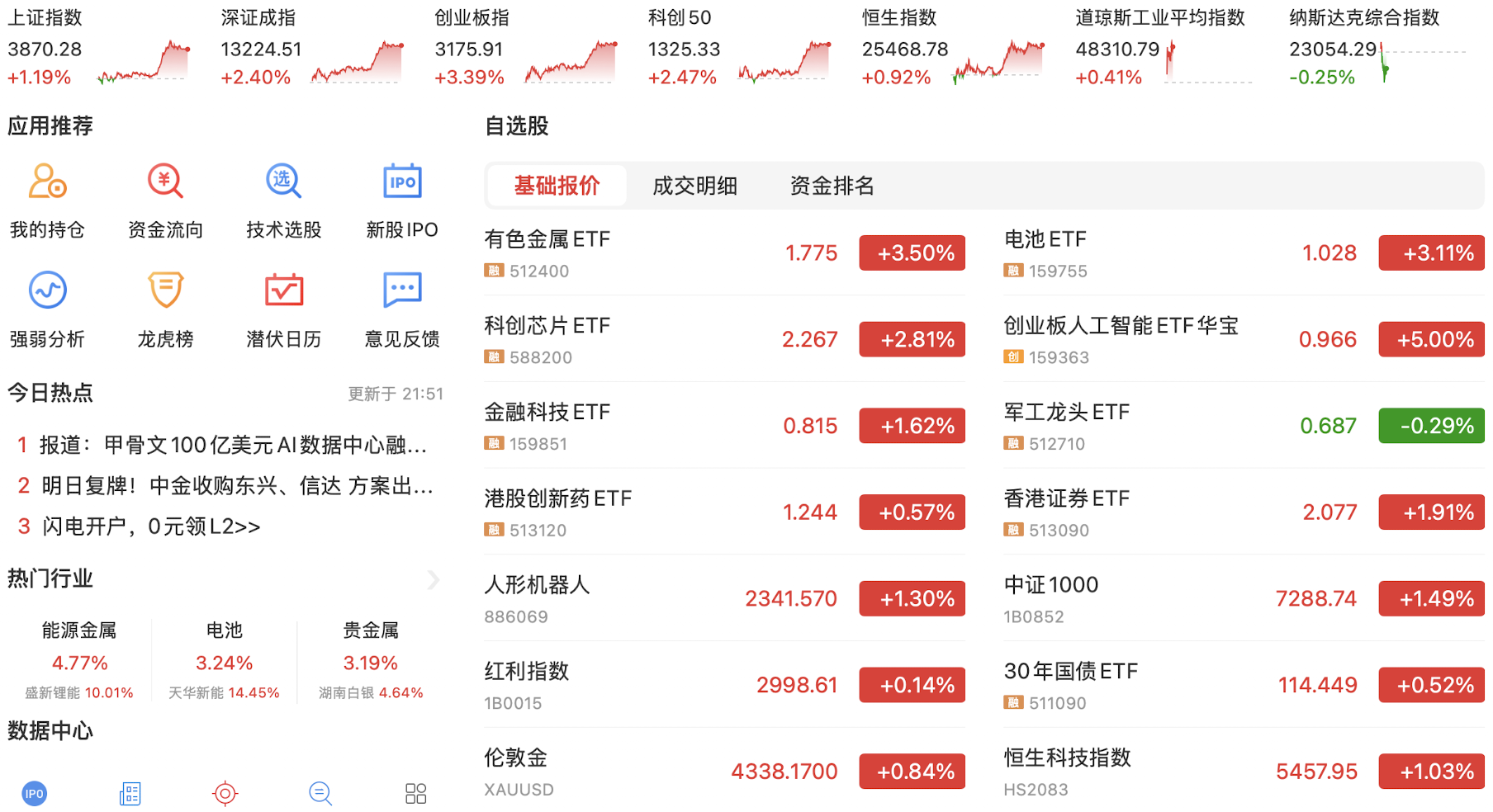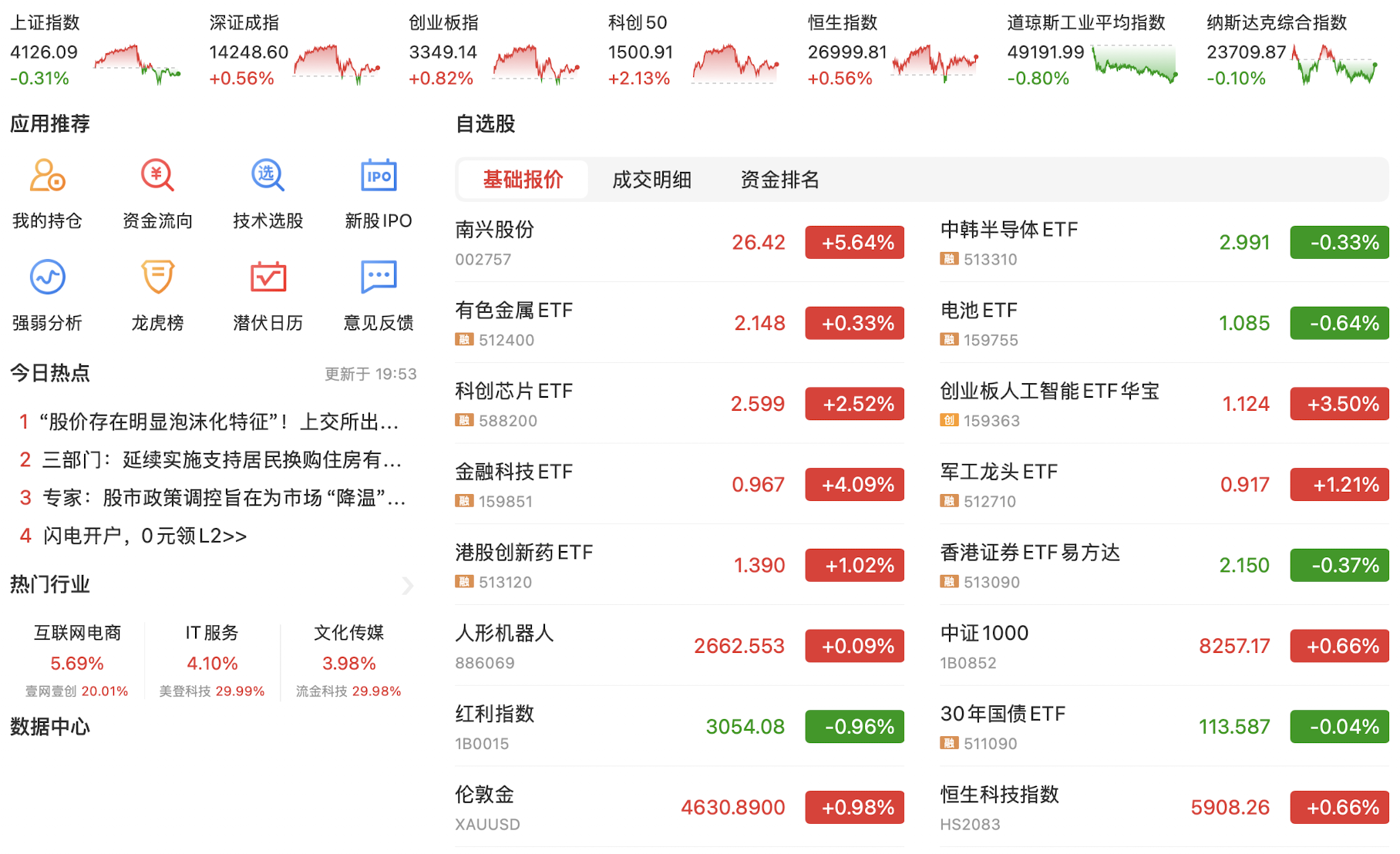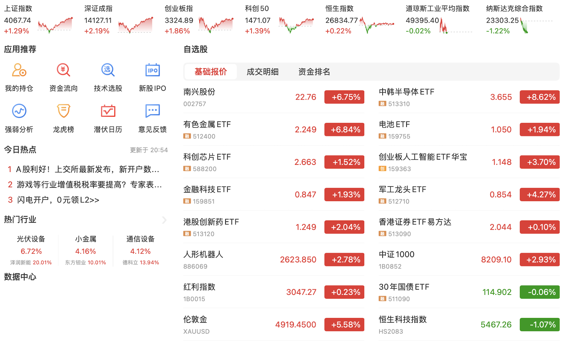 每天都在见证历史,今天上午资金疯狂涌入,直接把上交所服务器干崩溃了…导致今日上证指数和科创50指数在10点之后几乎无法成交,资金转头拉动股指期货和深证成指和创业板指,创业板指盘中最高涨近12%。目前的策略是尽早离开红利股,金融科技在本周大都上涨超50%,不宜追逐,逐渐布局还在次低位的科技股,尤其科创50和人工智能概念股。